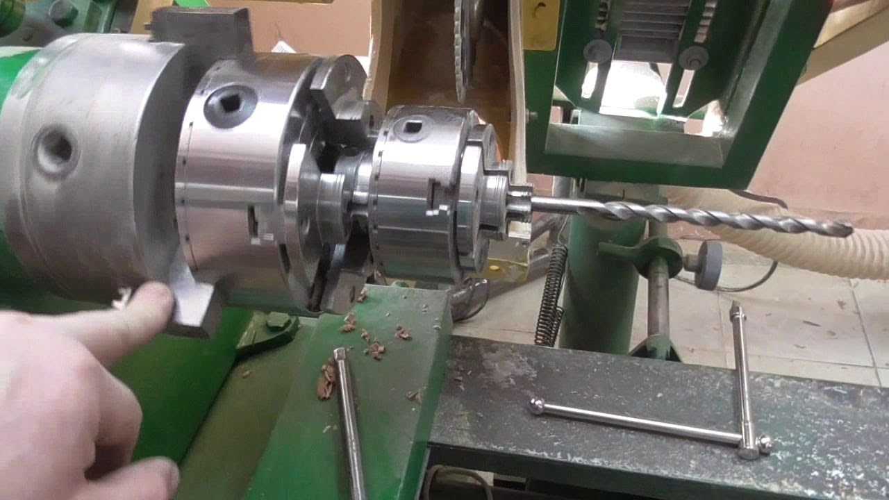 Напротив монтируется задняя бабка с помощью пары уголков и гвоздя или заточенного винта, до более совершенной, в которой дрель служит источником вращающей силы, но не участвует непосредственно в процессе вращения заготовки. Второй способ бережет мотор от перегрева и срыва при перегрузках.