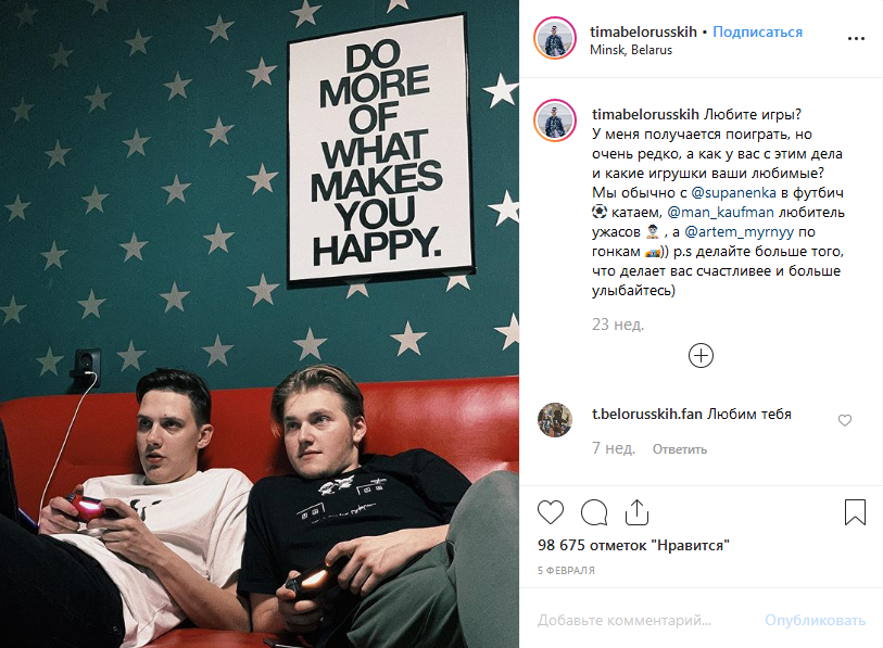 Сам певец тоже ведет персональный профиль в «Инстаграме», но использует его в качестве рабочей странички. Исполнитель любит родной город и уезжать из Минска не планирует. По словам Тимофея, он с радостью после гастролей возвращается на родные улицы, где прошли его детство и юность.