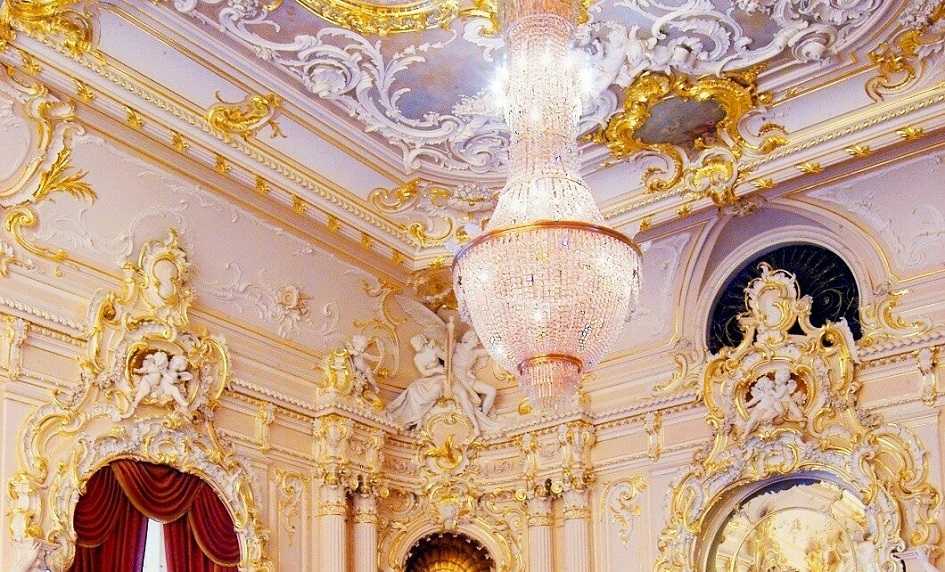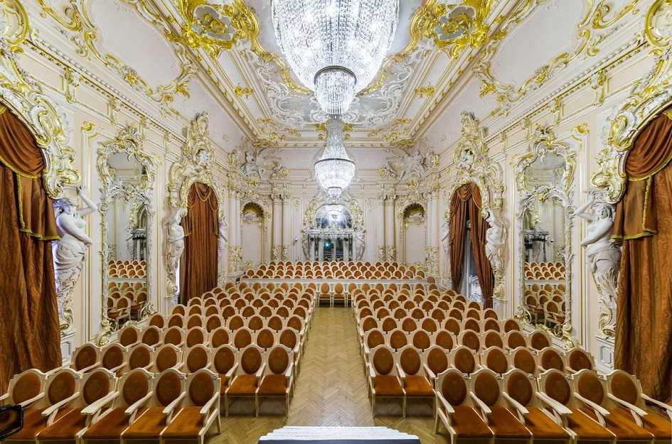 В особняке построили в стиле рококо большой театральный зал, вмещавший 173 зрителя, которые оказывались в окружении статуй и огромных зеркал XIX века на стенах. Неспроста на скульптурных женщинах-охотницах были львиные шкуры, ведь лев – один из символов рода фон Дервизов.