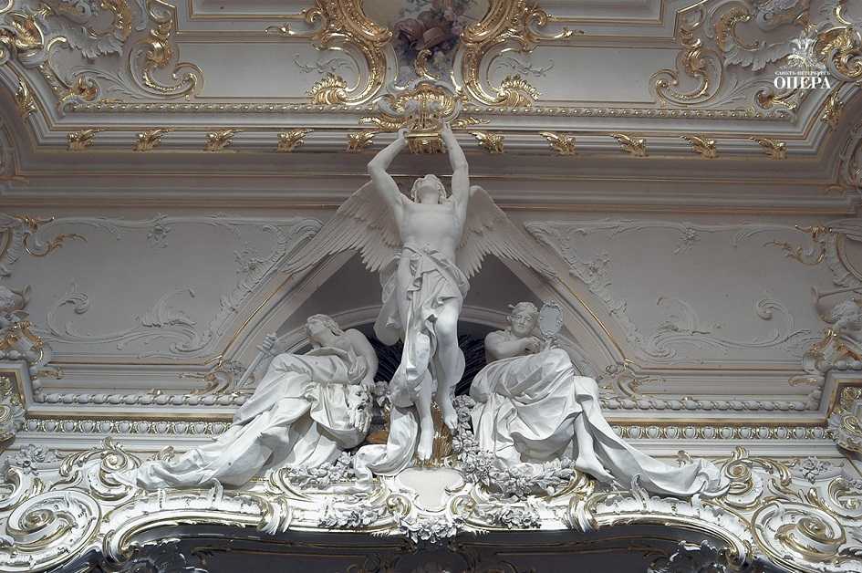 Над сценой возвышается крылатый Гений с лирой, расположены музы трагедии и комедии. В центре композиции — Гений Музыки с лирой в руках. Слева от него Мельпомена — муза трагедии, сжимающая в руках кинжал и трагическую маску. Справа муза комедии Талия.