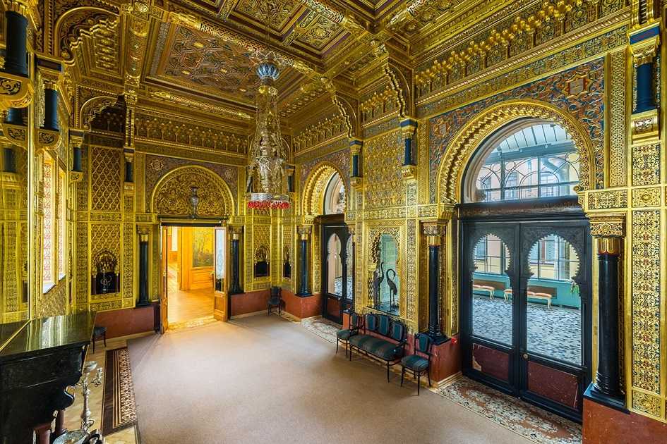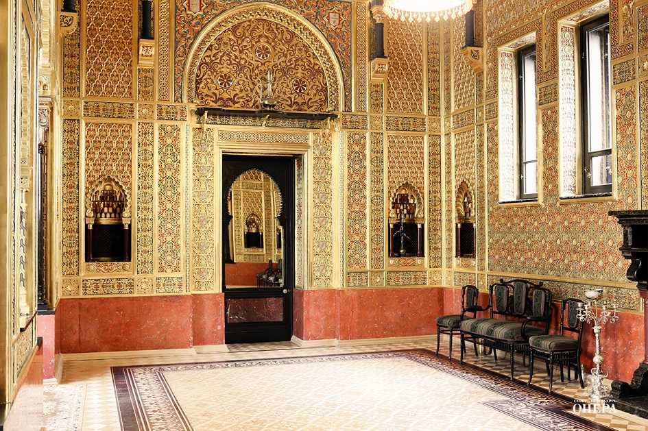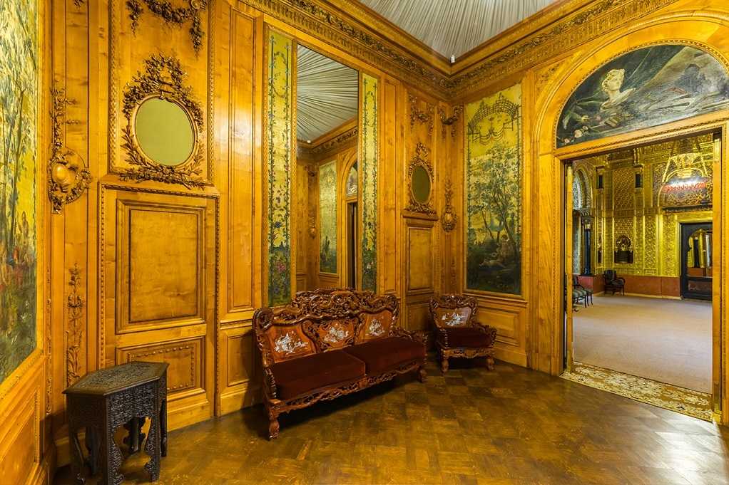 Одна из самых красивых и роскошных гостиных особняка. Потолок и стены зала покрыты позолоченным арабесковым орнаментом. В декоре стен использованы элементы герба барона фон Дервиза.