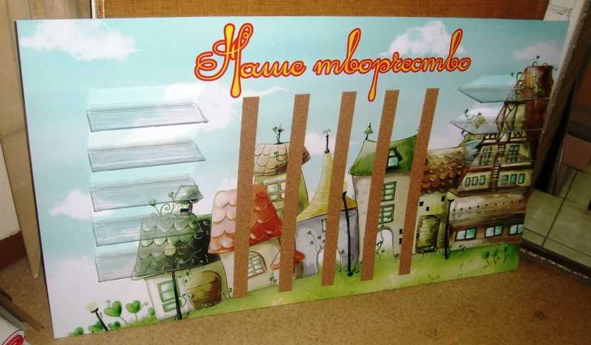 Приветствуется оформление в цветах. Но окантовка на стенде по цвету должна вписываться в общее его оформление. Рамка стенда может быть из пластмассовых планок, деревянных реечек. Используется профиль из металла. Очень важен прочный крепежный механизм. В процессе работы потребуются инструменты, в том числе и нож с острым лезвием. Их нужно подготовить. Исходя от места будущего размещения стенда, можно определить его размер. Пробковая древесина отрезается по выбранным размерам. Пробковая доска с материалом тыльной стороны склеиваются между собой «жидкими гвоздями». Пред этим их обезжиривают. Полученную основу стенда можно обтянуть материалом. На лицевую сторону прикрепляется обрамление. К тыльной стороне крепятся петли для съемного варианта стенда. Если стенд не будет сниматься со стены, то его можно поместить на стену при помощи двухстороннего скотча. Стенд готов к оформлению.