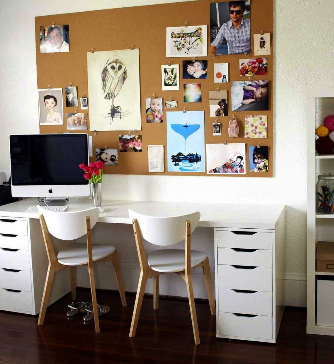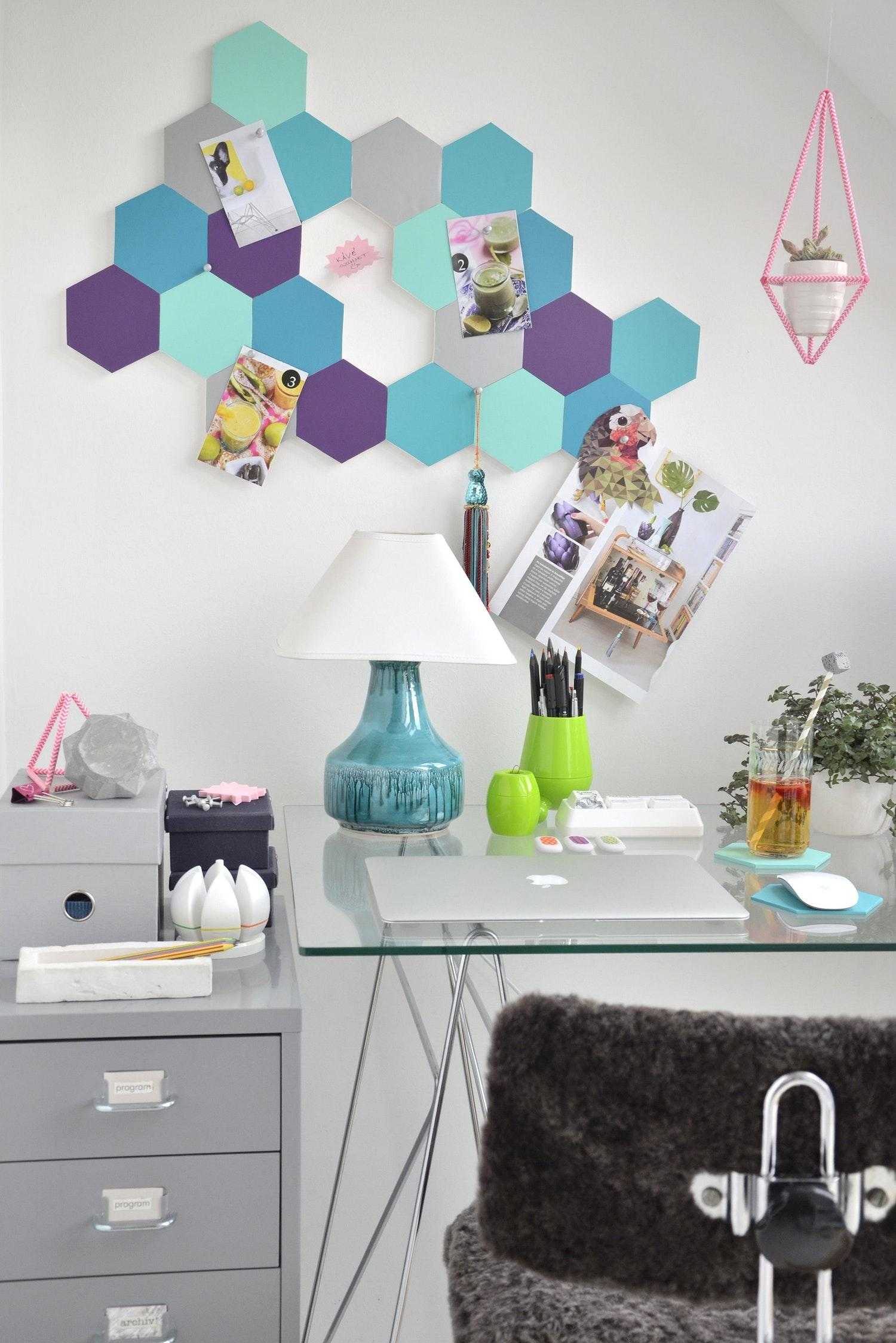 Отличным местом «жительства» для аксессуара станет пустующая над письменным столом стена. Полки в этой зоне могут выглядеть громоздко, а постеры и календари там как-то не совсем уместны. Декоративная же доска для заметок, да еще и сотворённая своими руками, станет оптимальным решением вопроса оформления рабочего уголка.