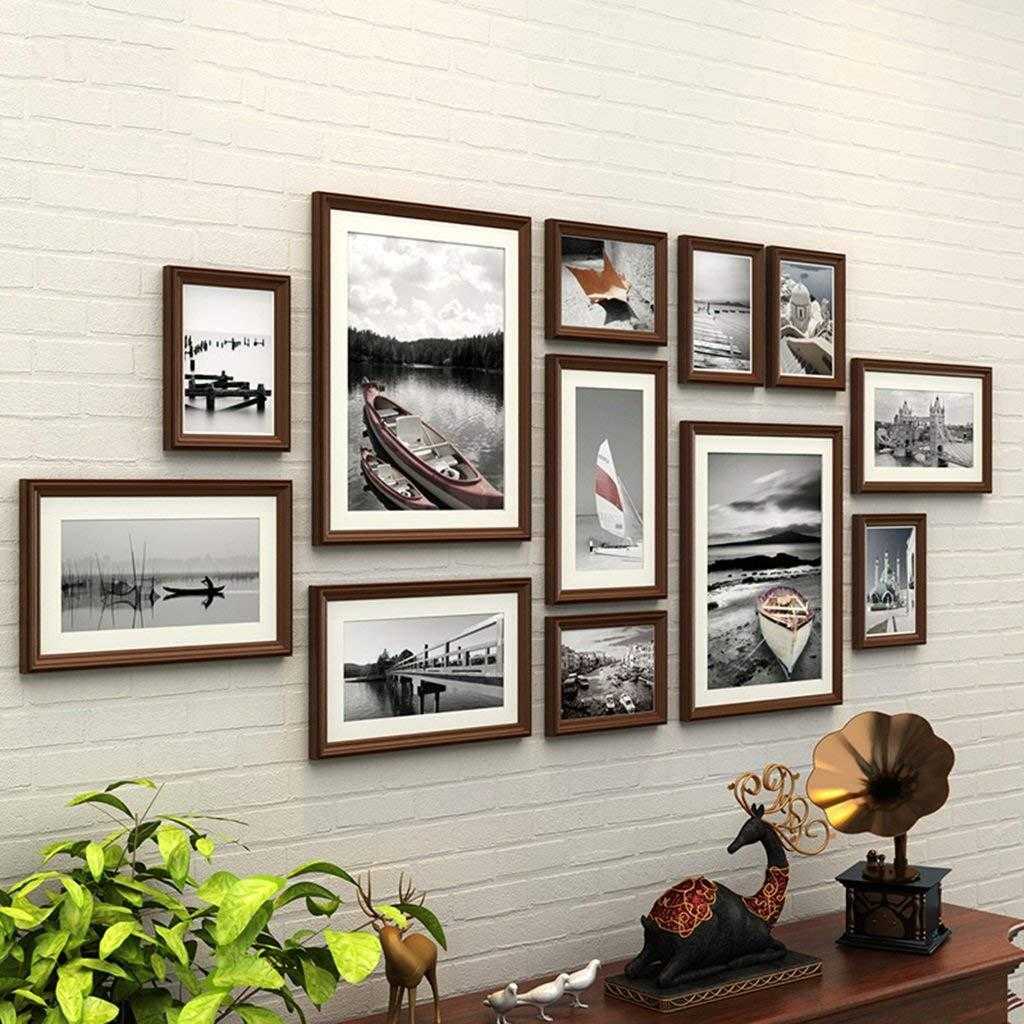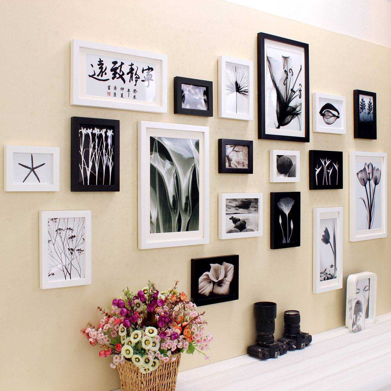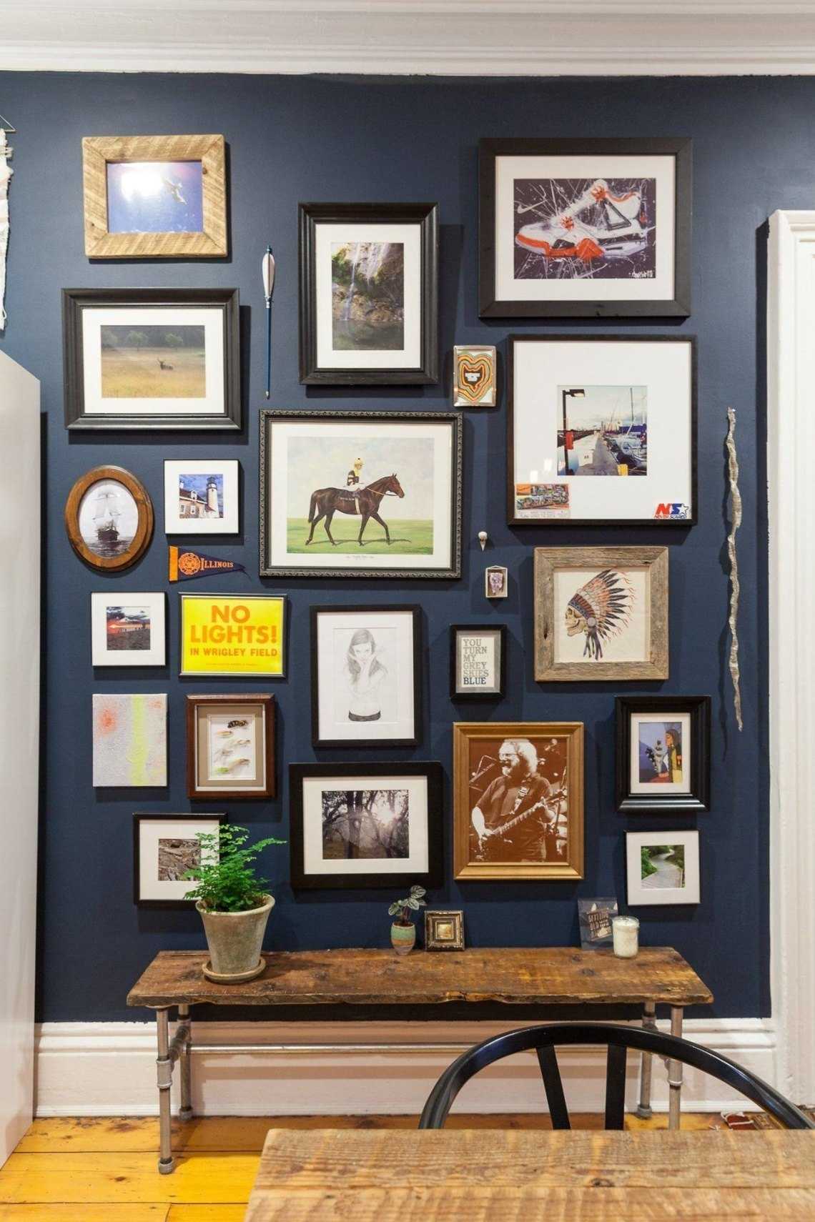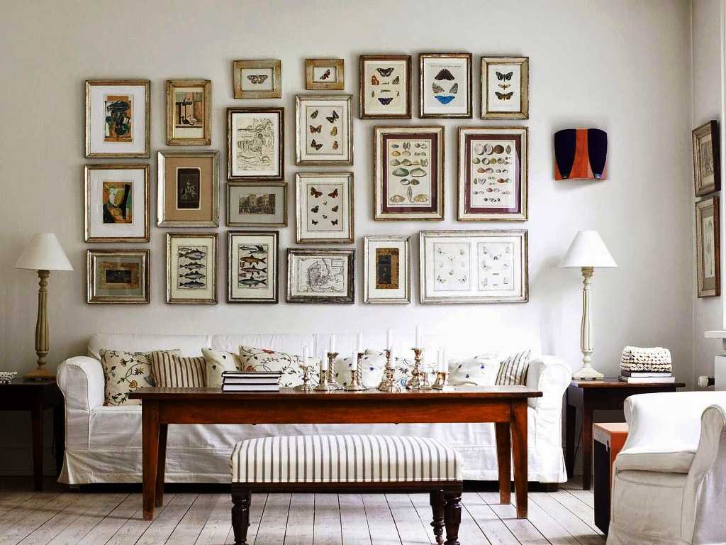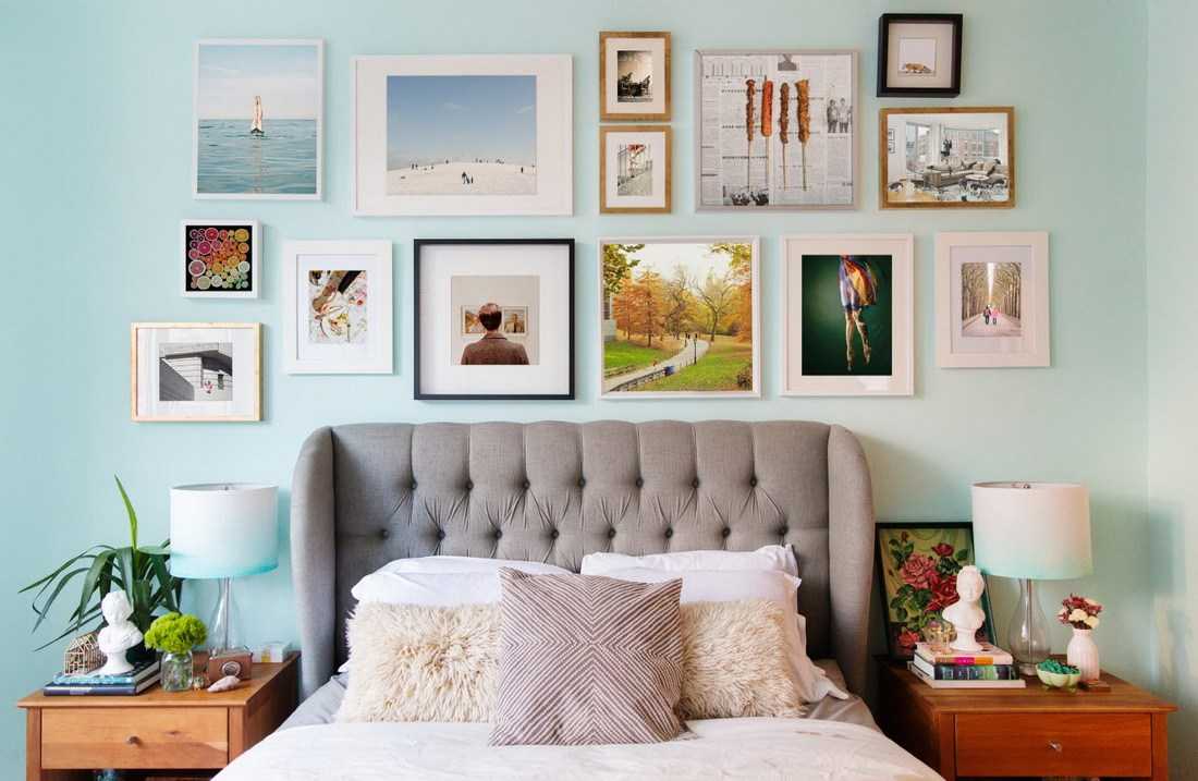 Чтобы отвлечь внимание от бледной стены, подойдут снимки любого размера, даже если не соблюдаются никакие требования относительно отступов и симметрии