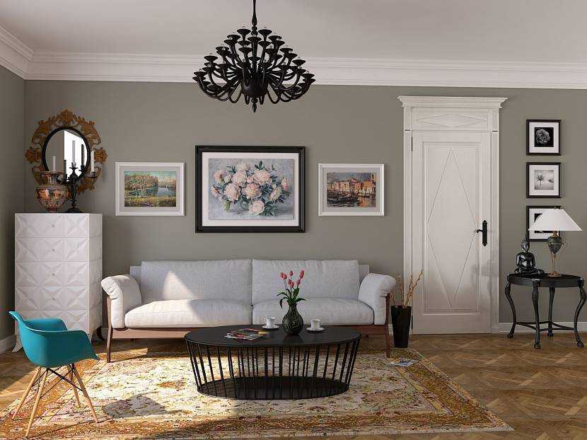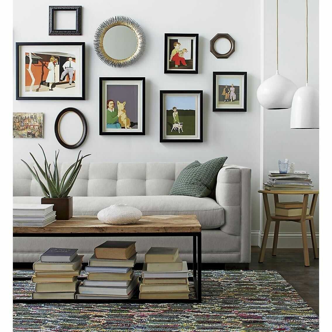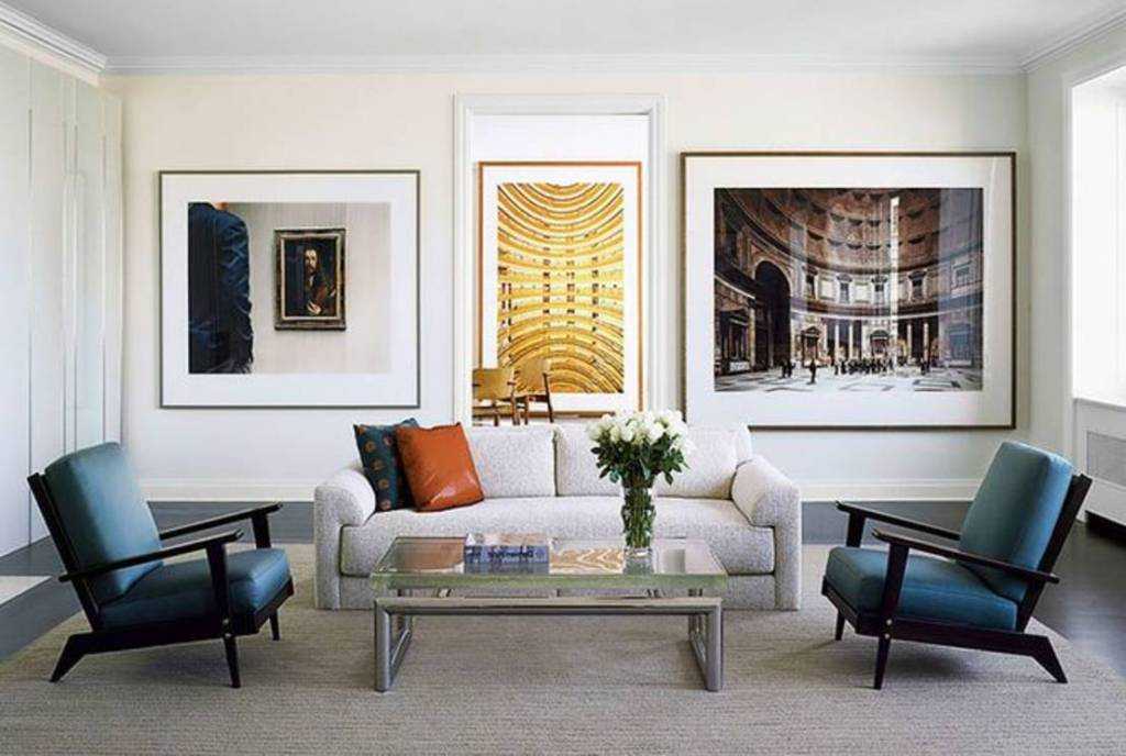 Одна большая тематическая картина. Ей необходимо большое пространство, и лучшим выбором станет стена за диваном. Классические полотна заключают в тяжелую резную раму; современные могут обойтись без обрамления. Если полотно большое, его центр будет находиться выше уровня глаз, поэтому оно подходит для украшения просторных комнат.