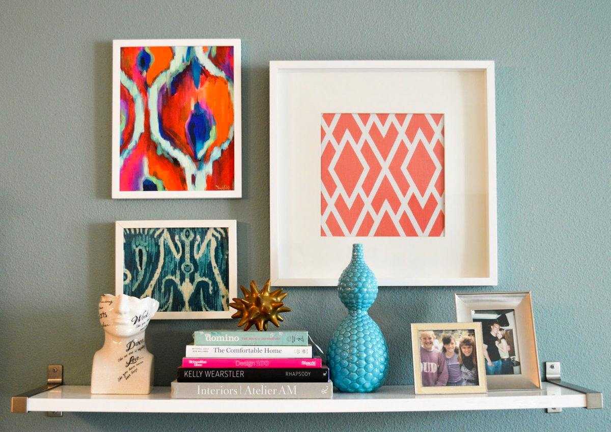 Картины на полке. Расположение картин на длинной узкой полке (или на камине) — проверенный способ упорядочить коллекцию. Здесь все логично: большие объекты расставляют на заднем плане, остальные — на переднем. Способ работает особенно хорошо, если все рамки разные по формату и оформлению.