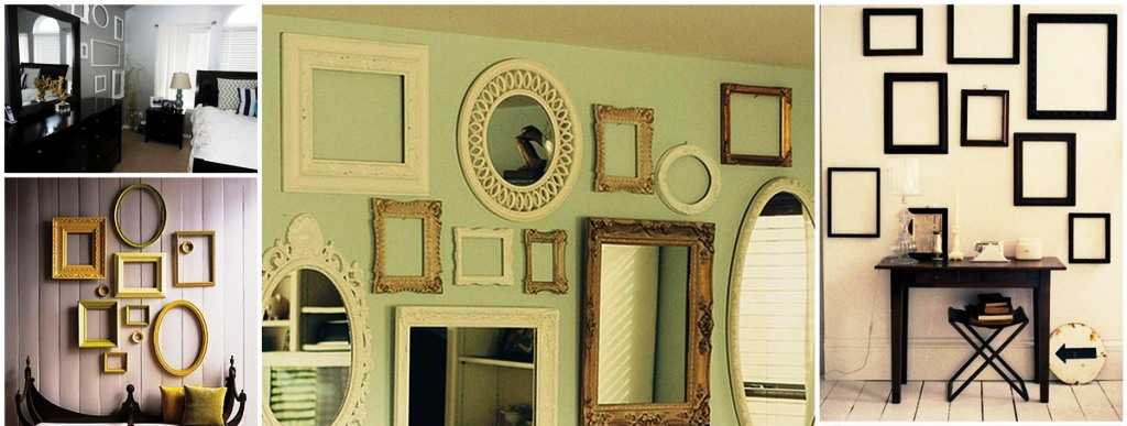 Рамки для одной экспозиции подбираются любые. Они могут быть овальными, прямоугольными, квадратными или круглыми различных размеров. Главное, чтобы формы рамок сочетались между собой, а в составленной экспозиции царила гармония.