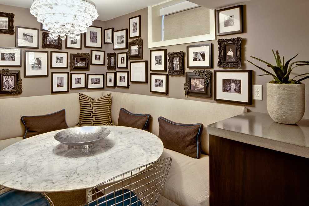 Еще оригинальные решения для гостиной. На одной стене располагаются функциональные ниши, а на другой большие фотографии в рамках.