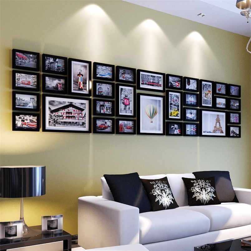 В гостиной прекрасно будет смотреться композиция «часы». Вокруг часового механизма устанавливаются фотографии (можно по возрасту расположить семейные фото, начиная со свадебных). Смотрится богато и достаточно оригинально. Также интересен вариант для гостиной фотопортретов, расположенных как картины и выдержанных в одном стиле. Оформленные таким образом фоторамки в интерьере будут выглядеть необычно.
