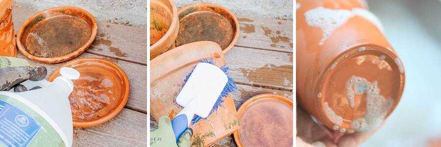Новый цветочный горшок промывают слабым раствором марганцовки для дезинфекции. После использования сосуда проделывают ту же процедуру. Керамические контейнеры в течение срока эксплуатации чистят с помощью сырой картофельной мякоти. Она удаляет известковый налет и разводы, которые появляются со временем на внешней стороне стенок. После чистки сосуд промывают в чистой воде.