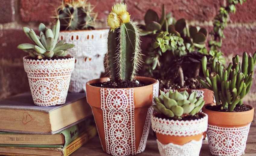 Трендовым направление в дизайне считается использование кружева. Ленту достаточно просто приклеить по верхней и/или нижней части кашпо. После высыхания с помощью аэрозольной краски создаётся защитный слой. При работе с широким кружевом, покрывающим всю поверхность вазона, рекомендуется предварительно смочить в воде деталь кроя. Это сделает её податливой.