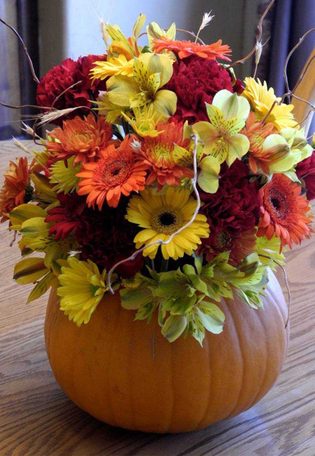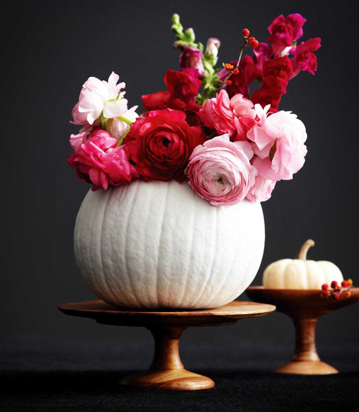 Тыква – прекрасная основа для создания осенней икебаны. Она устойчива на любой поверхности, имеет яркий цвет, который гармонирует с другими элементами композиции. И главное, благодаря специфической структуре полости тыквы, в нее можно вставить любые веточки, листья или цветы.