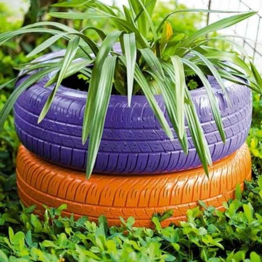 Совершенно непривлекательные автомобильные покрышки превращаются в красивые клумбы. Шины режутся, края шлифуются болгаркой с наждачной насадкой. Полученные вазоны моются мыльным раствором и просушиваются: растения не будут хорошо развиваться, если не вымыть машинное масло, бензин и другие подобные вещества, которые попадают внутрь.