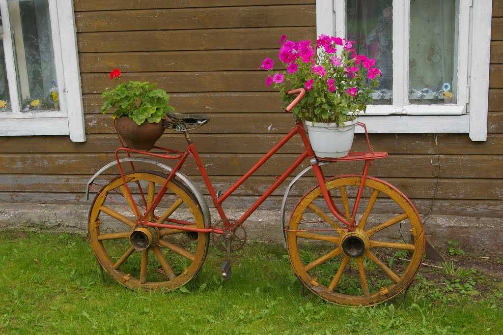 Покрасьте раму, обновите сетку-багажник на руле и поставьте туда пару горшков с многолетними цветами. Вот у вас на дачном участке уже появилась непросто оригинальная клумба, а целый арт-объект, способный стать вашей личной достопримечательностью.