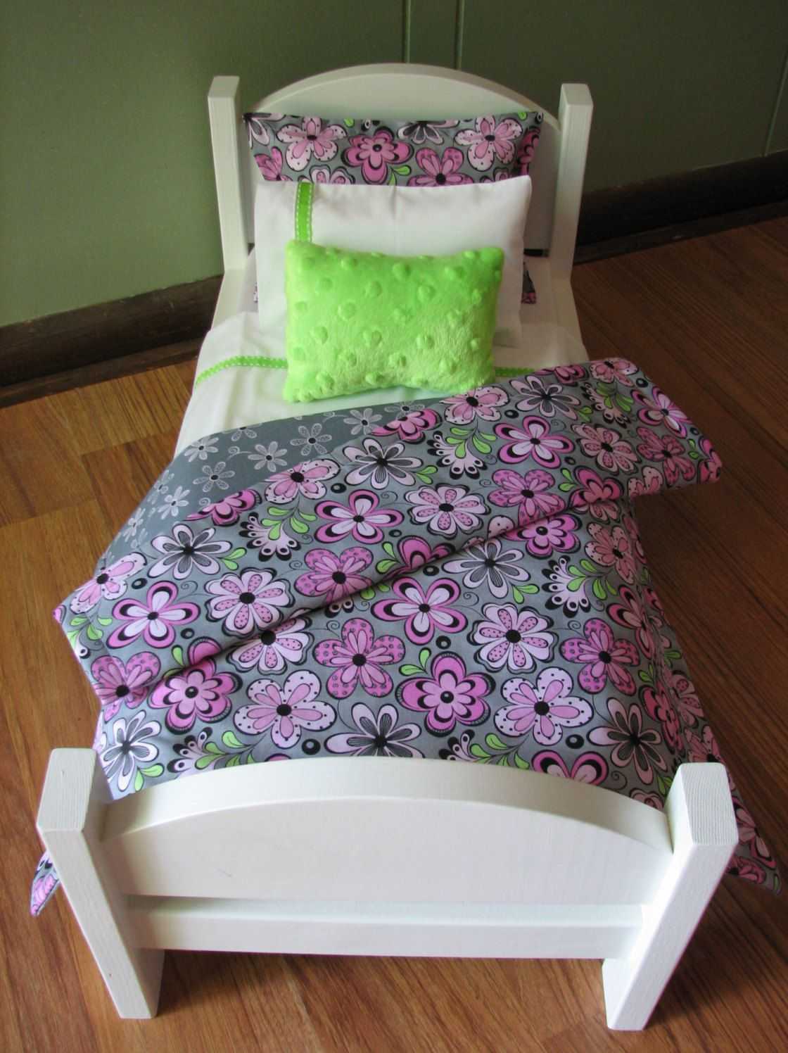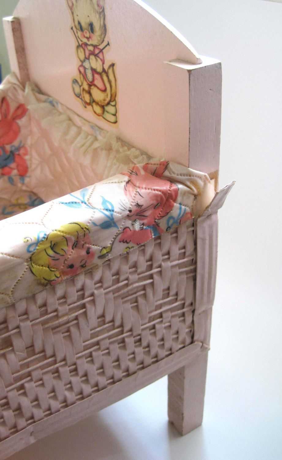 После этого можно перейти к оформлению кровати. Обклеить ее красивой бумагой, покрыть тканью основание кровати, сшить подушки и одеяло.