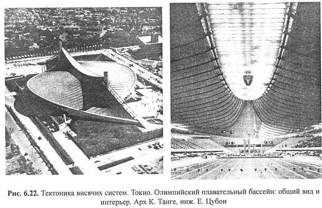 Рис. 6.22. Токио. Олимпийский плавательный бассейнВнедрены многочисленные варианты висячих систем. Среди них далеко не все получили тектоническую трактовку. Так например, мембранные и двухпоясные системы покрытий с плоским опорным контуром, примененные в Олимпийских Дворцах спорта Москвы и С.-Петербурга, в Бауманском рынке в Москве (рис. 6.21, а), не отражены в объемных композиции этих зданий.