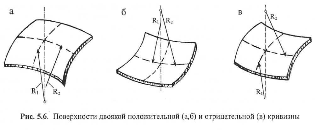 Рис. 5.6. Поверхности двоякой положительной и отрицательной кривизныЗнак кривизны зависит от расположения центров радиусов кривизны по отношению к поверхности. При расположении центров по одну ее сторону К имеет положительное значение, по обе стороны — отрицательное (рис. 5.6). К поверхностям положительной гауссовой кривизны относятся все купольные оболочки (сфероид или эллипсоид вращения и т.п.), оболочки переноса, бочарные своды и т.п. характерным примером поверхности отрицательной кривизны является гиперболический параболоид, формируемый перемещением параболы с ветвями вверх по параболе с ветвями вниз (рис. 5.7).