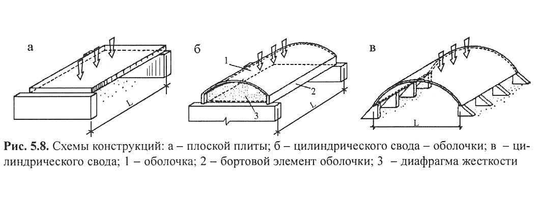 Рис. 5.8. Схемы конструкцийЦилиндрический свод-оболочка — безраспорная конструкция, работающая на поперечный изгиб как балка пространственной формы, свод — распорная конструкция, работающая преимущественно на осевые усилия. Для обеспечения последнего условия кривая свода принимается пологой, в то время как для повышения жесткости свода-оболочки целесообразна большая кривизна формы, наконец, продольная ось длинного цилиндрического свода-оболочки размещается параллельно перекрываемому пролету, а продольная ось свода — перпендикулярно ему.