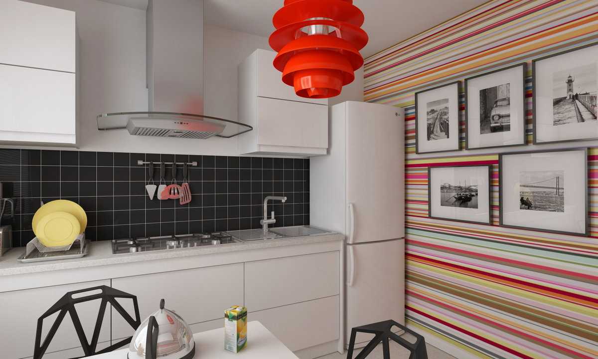 Маленькие кухни, особенно кухни в хрущевках, можно визуально увеличить в квадратуре, если не ограничиваться в оформлении стен традиционной плиткой, а использовать выразительные яркие обои. Геометрические рисунки, полоски или фигуры как нельзя лучше подчеркивают геометрию кухонных приборов и техники. А яркие акценты добавляют динамики и маленькая комната кажется больше.