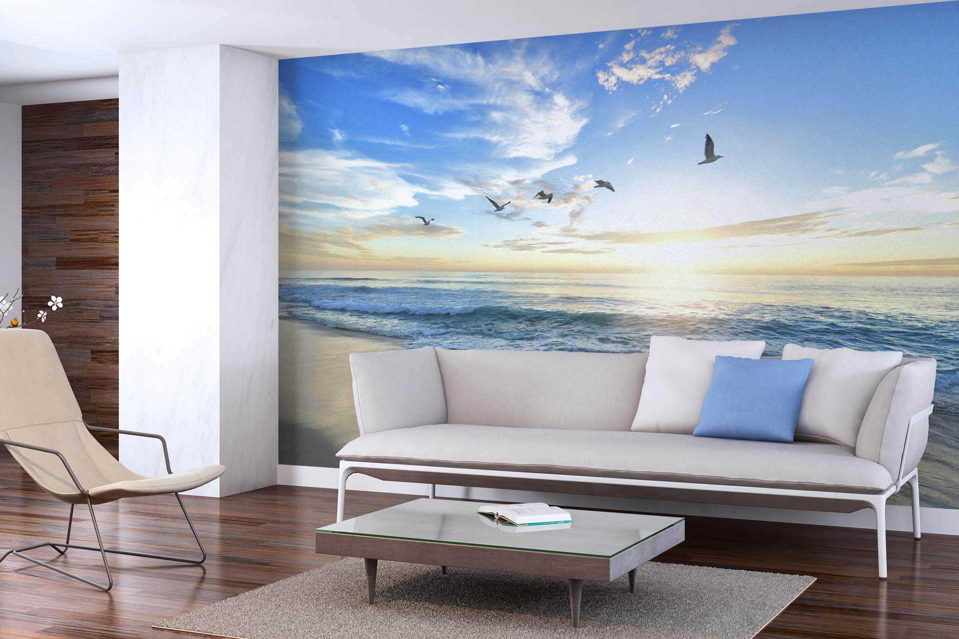 - фотообои, расширяющие пространство, — это достаточно активный элемент интерьера, потому остальные элементы отделки должны быть более спокойными. Это в первую очередь касается напольного покрытия и оформления остальных стен.