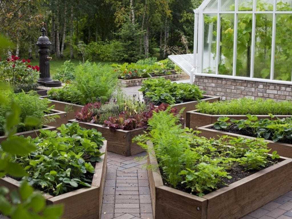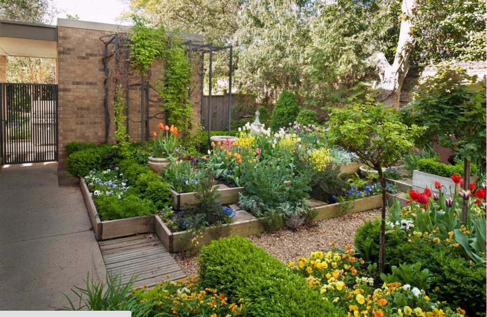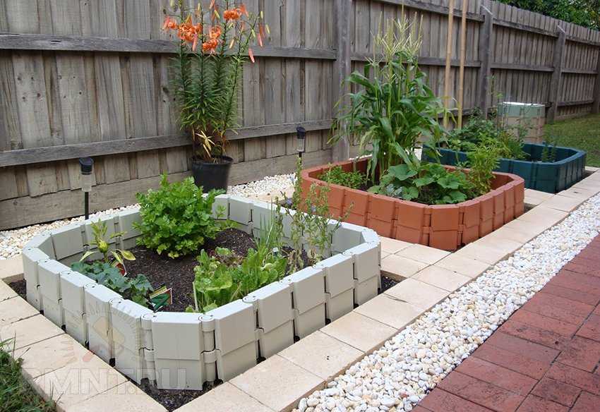 Балки размещены под углами к забору и в каждой «зоне роста» посажено только одно растение. Также здесь используется комбинация с декорацией мелкими камушками.