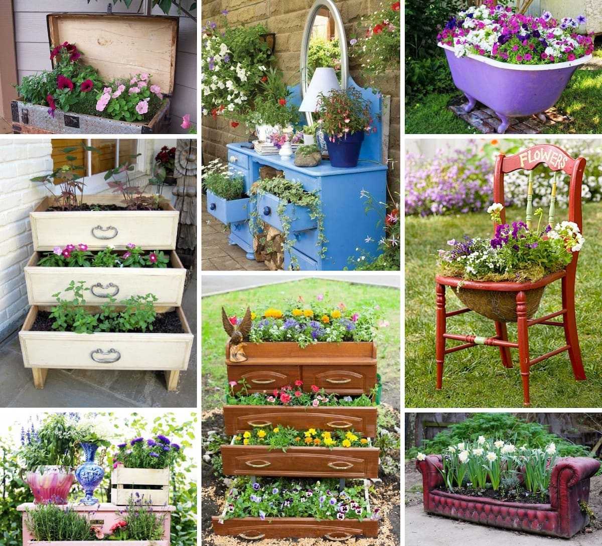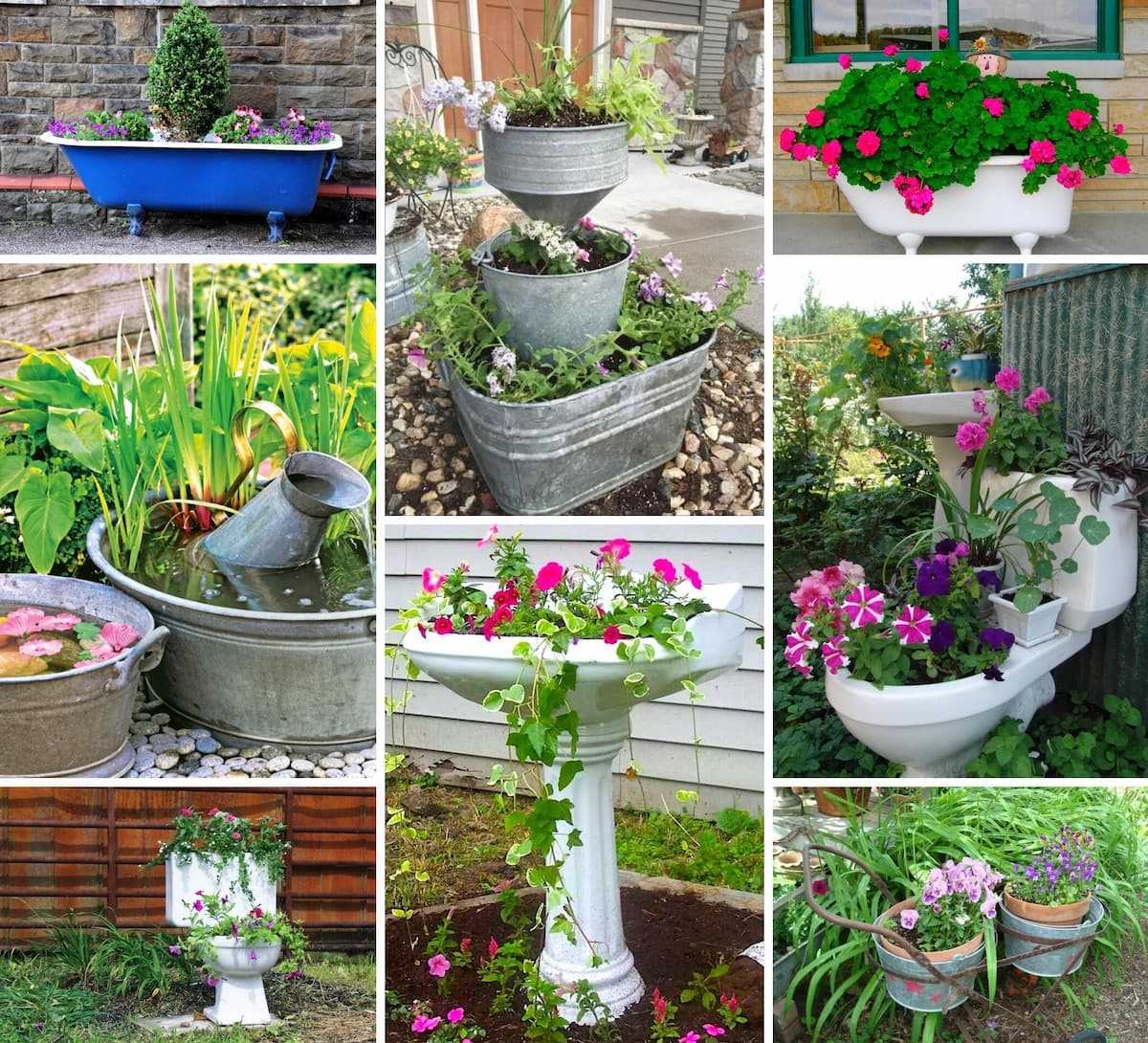 Для наклонных полувертикальных клумб подойдут ненужные большие емкости (ванны, тазики) и даже старая телега.