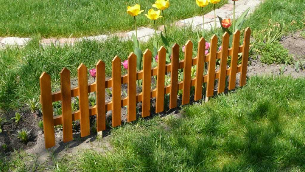 Однако перед тем, как его устанавливать, все же рекомендуем нанести специальную пропитку, которая продлит долговечность. При желании можно покрасить такой заборчик, чтобы он лучше сочетался с цветами.