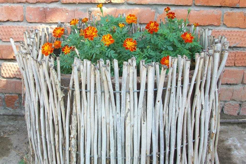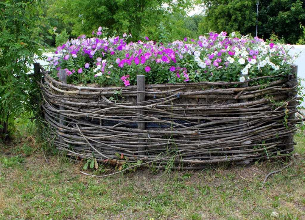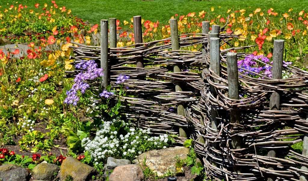 Использование прутьев для ограждений было известно еще несколько веков назад. Плетение прекрасно вписывается и сегодня в ландшафтный дизайн современных участков. Создать плетеный бордюр для клумбы можно самостоятельно. Для этого вам понадобятся нетолстые колышки и ровные ветви лозы или ивы. Ветви этих растений довольно прочные, при этом очень хорошо гнутся, что упрощает работу. Чтобы придать больше гибкости ветвям, их необходимо вымочить в горячей воде и работать с ними до того, как заготовки высохнут.