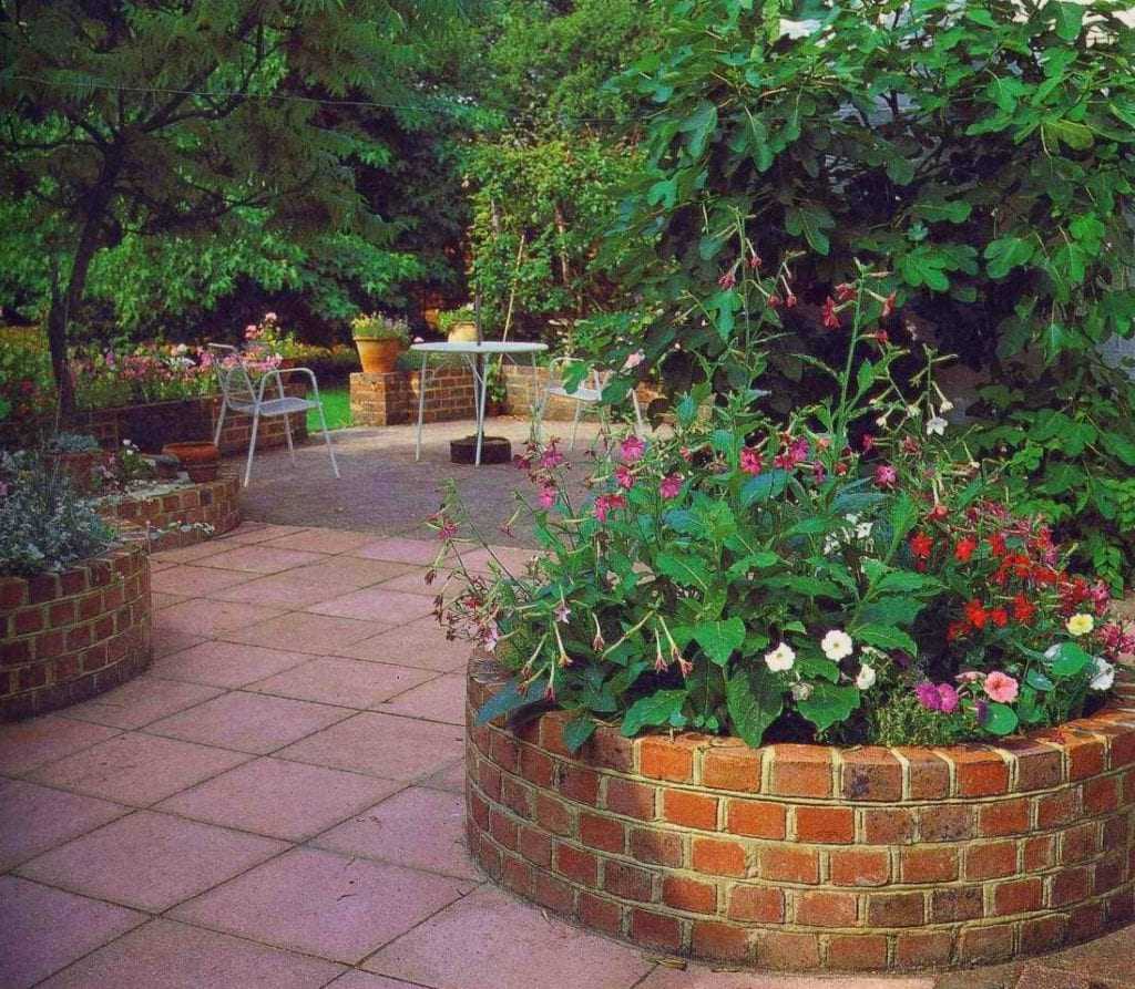Если же необходимо огородить высокую клумбу, то кирпич укладывается в несколько слоев. Для поднятых грядок из него формируют стену без зазоров. При возведении больших ограждений высотой от 30 см под кладку кирпича выливают неглубокий фундамент. Это позволит возведенной стеночке держаться крепче и создаст дополнительный барьер для корневой системы.