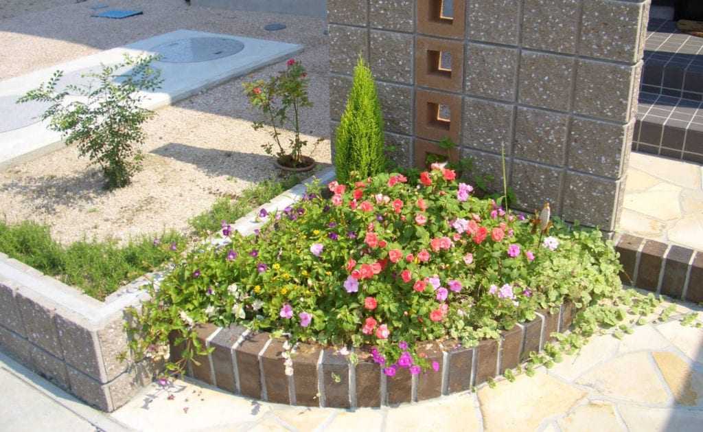 Клумбы из кирпича имеют различное оформление, высоту и характеристики. Для ограждения грядок, высота которых совпадает с уровнем земли, возводится небольшой бордюр. В таком случае для декоративного оформления используется один слой кирпича, который может устанавливаться любым удобным способом: вертикально, горизонтально, а также на угол, что позволяет создать фигурное обрамление для клумбы.