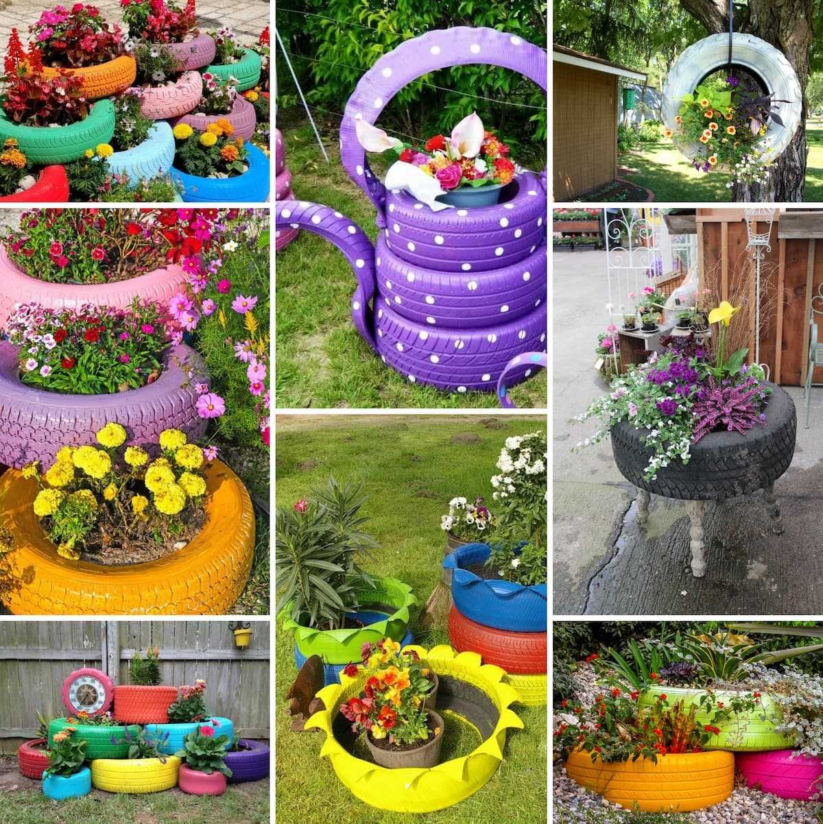 Другой популярный вариант — клумба из старых автомобильных покрышек.