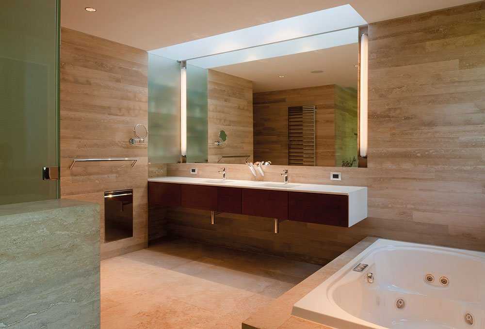 Здесь также нет никаких ограничений. Выложить пол досками из карельской березы или сибирского кедра, оформить стены узкими деревянными панелями, создать раму для зеркала высотой со стену или подиум под ванну — лишь малые возможности этого материала.