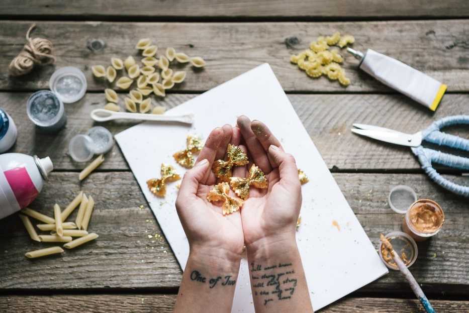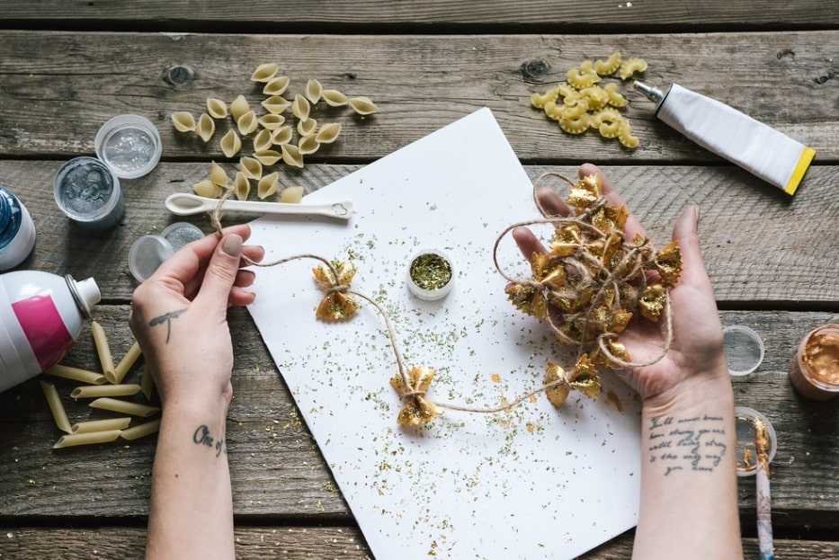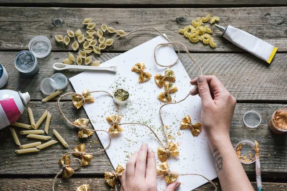 Вначале сделаем оригинальную гирлянду из макарон-бантиков. Для этого окрашиваем каждую из них краской золотистого цвета. Сделать это нужно с двух сторон.