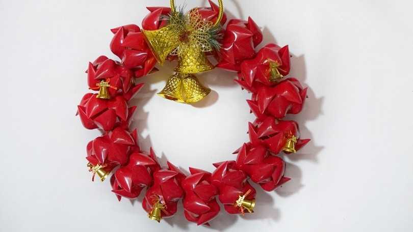 - Рождественский венок. Сделать его очень просто. Есть несколько вариантов «пластиковых» венков, а один из вариантов, показан пошагово на фото. Но способов соединения таких «колокольчиков» из бутылочных донышек, как и способов оформления самого веночка, очень много. Включайте фантазию и делайте свой, неповторимый рождественский декор.