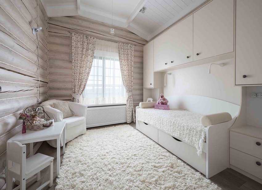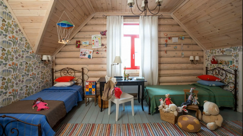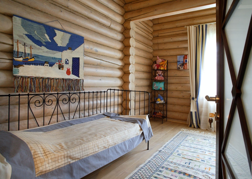 Дизайнерская мысль при оформлении детской комнаты также останавливается на сохранении округлой текстуры ствола. Нижняя часть одной из стен может быть закрыта легко снимаемыми фанерными листами или досками: в этом месте ребенок может реализовать свои попытки научиться «рисовать» стены».