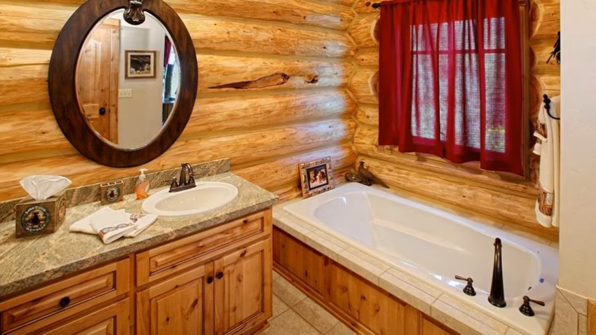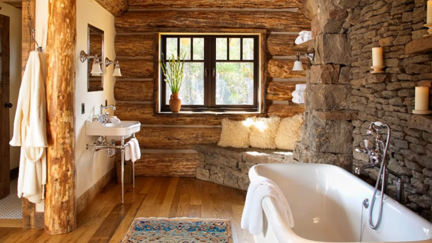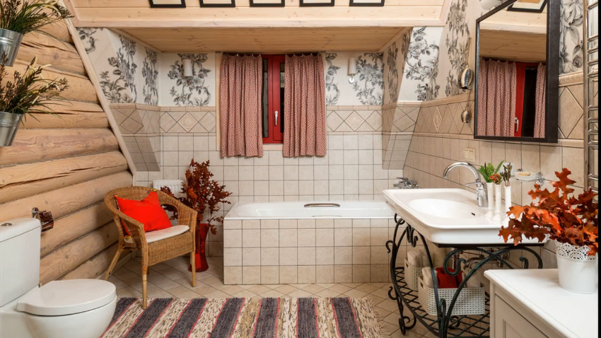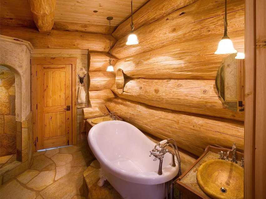 В единственном помещении в доме с обычной влажностью стены требуют максимальной защиты. Потолок, стены и пол в ванной необходимо обработать антисептиками. Стеклянные полки и столы будут хорошо смотреться с деревянными стенами. Лучше всего покрыть пол в ванной керамической или керамогранитной плиткой. Элегантно смотрятся в ванной комнате изделия из дерева или плетеные корзины для белья.