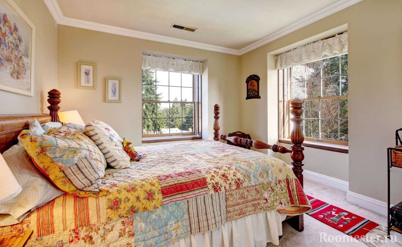 В спальне в деревенском стиле рекомендуется разместить большой комод или комод из массива дерева. На пол следует положить несколько небольших ковриков. Стены украшены картинами с изображением пейзажей и животных .