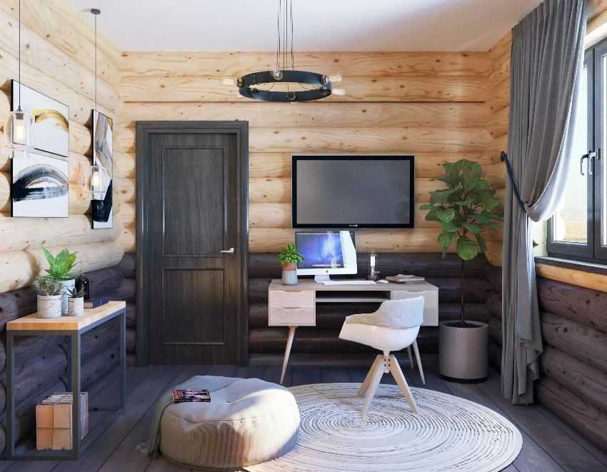 Интерьер домашнего офиса в деревянном доме хорошо смотрится в отделке темными породами дерева