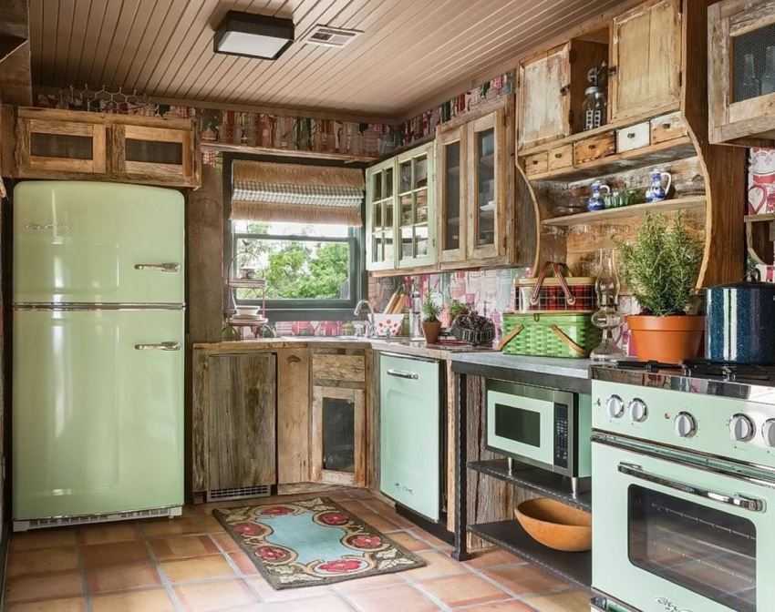 Мебель выбирайте деревянную, грубую или резными узорами. Возможно использование кованых или ротанговых элементов. Бытовую технику прячьте под фасады либо выбирайте стилизованные под старину объекты.