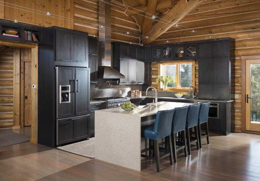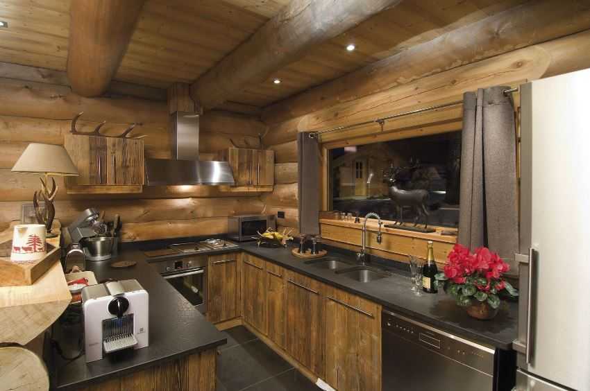 Элементы современной техники и электроники легко вписываются в интерьер бревенчатого дома. Особенно с успехом применяется встроенная техника — достаточно сделать деревянный шкаф или нишу и разместить в них технику. Холодильник, морозильник, стиральную и посудомоечную машины можно хранить в шкафах, которые будут закрыты дверцами, выполненными в том же стиле, что и комната.