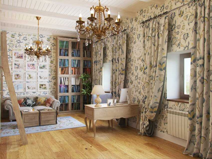 - Стены тоже могут быть деревянными, окрашенными в нейтральные оттенки (но лучше — белоснежными). Можно также использовать обои под старину, которые имитируют текстиль.