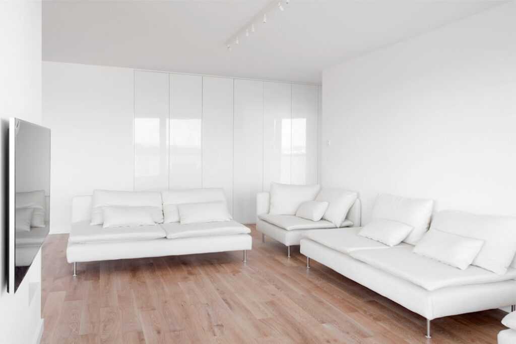 Палитра белых оттенков очень часто применяется в современном дизайне в стиле минимализм. Белоснежные тона в сочетании с серыми оттенками и грамотно подобранной меблировкой, позволяют добиться гармоничной и уютной атмосферы. В комнате отсутствует лишний декор, но для светлых стен можно выбрать черно-белые фотографии в монохромных рамах.