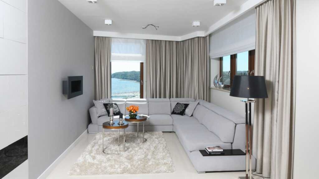 Чтобы гостиная выглядела уютно, позаботьтесь о текстиле. Шторы, коврики, подушки могут быть холодных и теплых оттенков серого, но обратите внимание на структуру и фактуру тканей. Стоит сопоставить плотные плотные шторы с рельефным рисунком с подушками и подушками в гладких, серебристых, стеганых или пушистых наволочках. Наш совет: в композицию, состоящую из двухцветных оттенков, добавьте цветовой акцент, который привлечет внимание. Это может быть, например, розовая подушка и абажур. Цветные книжные обложки в книжном шкафу будут играть аналогичную роль