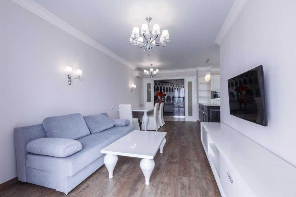 Оформленное в бело-черной палитре помещение гостиной в квартире с добавлением серого смотрится сдержанно и элегантно.