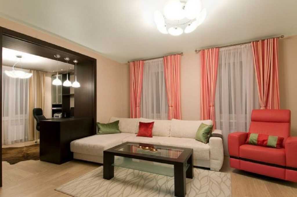 Можно использовать стандартный вариант: около длинной стены размещается диван, по бокам ставят кресла, а напротив – небольшой журнальный столик. Занавески выбирают из тюля или шелка.