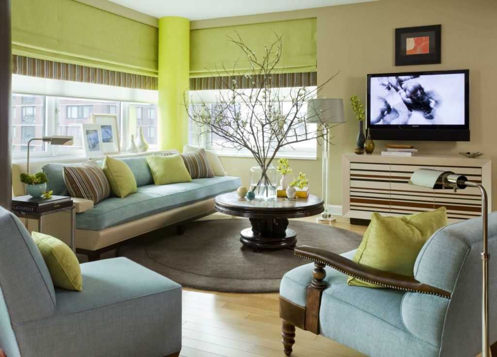 Оформите гостиную среднего размера в приятных природных цветах. Выбирайте светло-коричневый, фисташковый, серый, шоколадный, песочный, бежевый, ореховый цвета.
