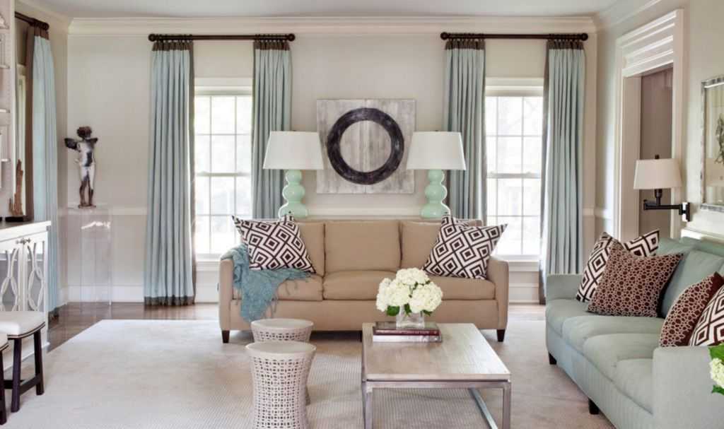 Интерьер гостиной с двумя окнами необходимо оформлять внимательно, не теряя чувства меры, особенно при подборе занавесок. Оба окна нужно украсить одинаковыми шторами, цвет которых совпадает с цветом декоративных элементов, подушек, покрывал, скатерти, ковра на полу.