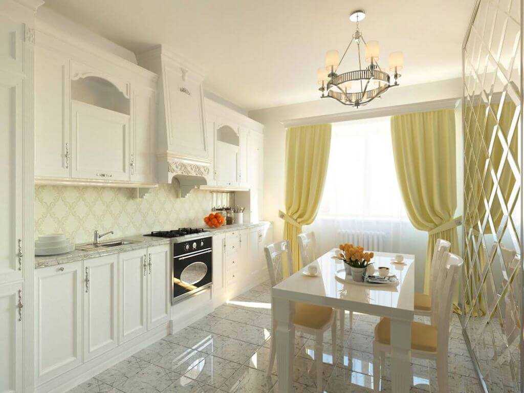Для такого большого помещения, как 11-метровая кухня, практически нет ограничений. Единственное — не стоит оформлять кухню в стиле ампир, если она не совмещена с гостиной. Подобный интерьер требует очень большие пространства — от 15–20 кв.м.