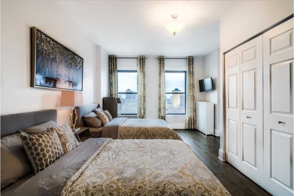 Для помещения удлиненной прямоугольной формы дизайнеры рекомендуют подбирать угловой, встроенный либо узкий гардеробный шкаф. Под удобной двуспальной кроватью имеется достаточно пространства для хранения вещей.