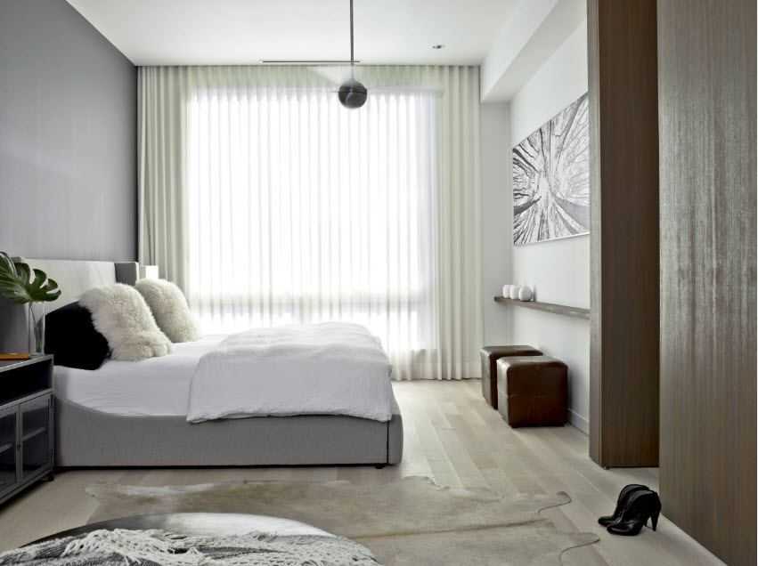 Опытные дизайнеры рекомендуют размещать в таких спальнях рулонные шторы, плотно закрывающие оконное стекло, либо вертикальные жалюзи на тканевой основе.